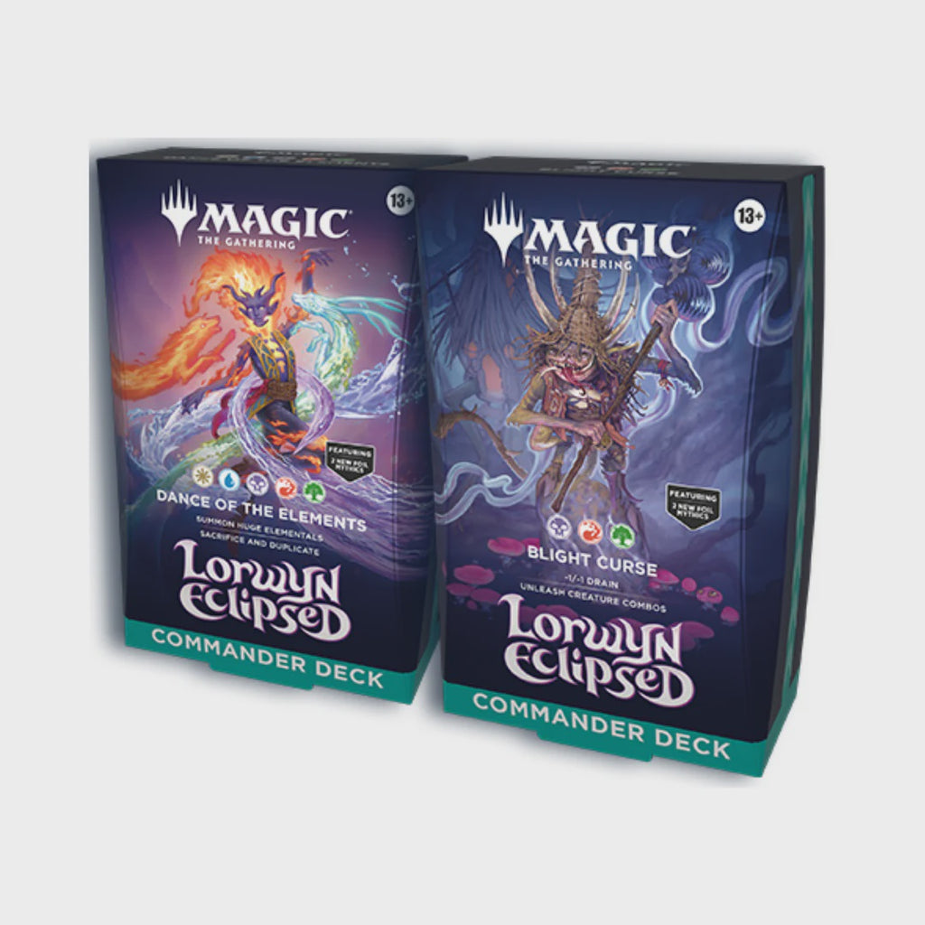 El Set Completo de Mazos Commander de Lorwyn Eclipsed reúne los dos mazos oficiales de la expansión —Dance of the Elements y Blight Curse— en una sola caja perfecta para coleccionistas, jugadores y tiendas que buscan la experiencia completa del regreso a Lorwyn y Shadowmoor.