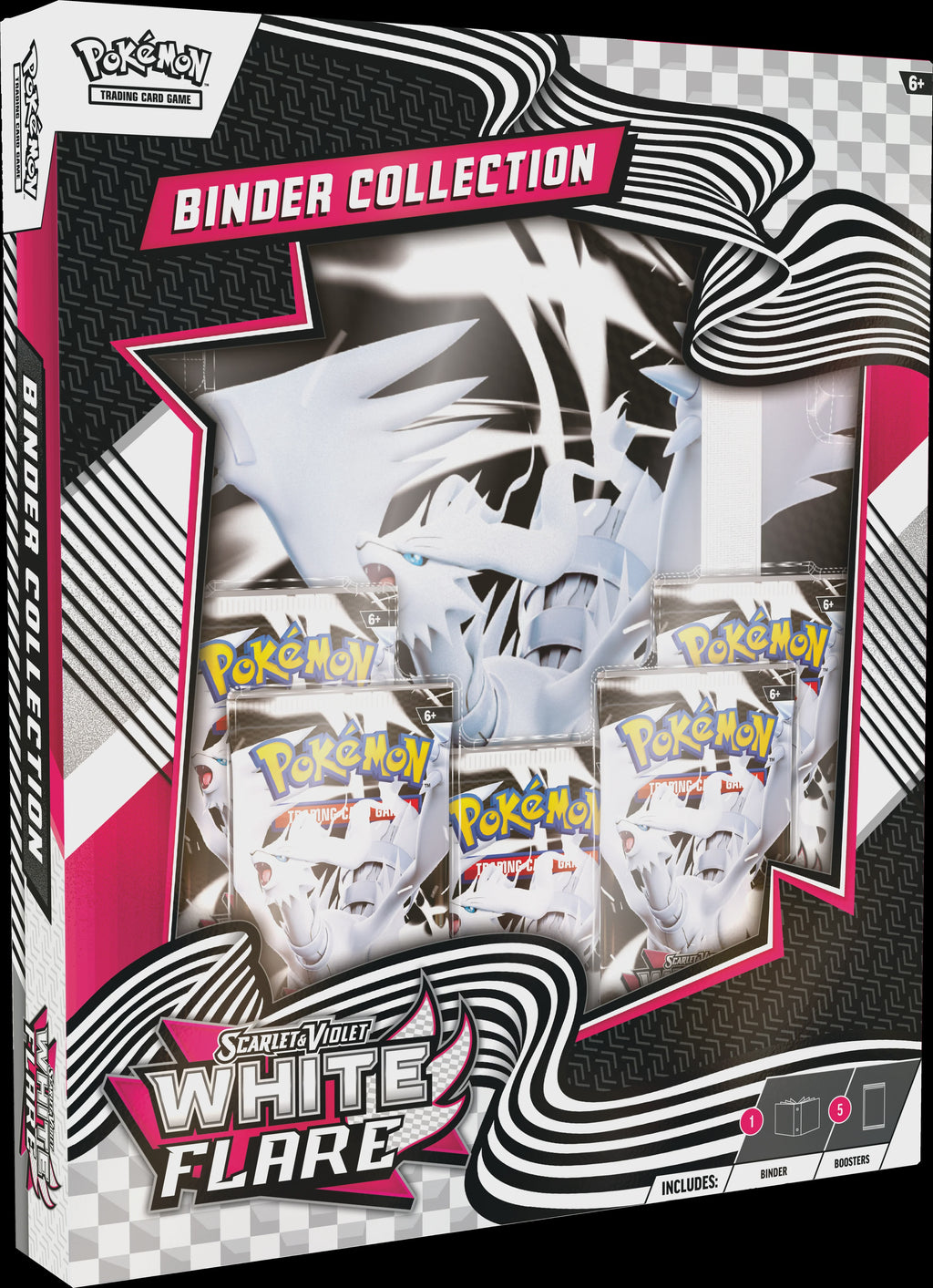Incluye cinco paquetes de refuerzo de Scarlet & Violet—Black Bolt o Scarlet & Violet—White Flare, respectivamente; y un álbum de nueve bolsillos con Zekrom o Reshiram, respectivamente, para organizar y almacenar cartas de JCC Pokémon.